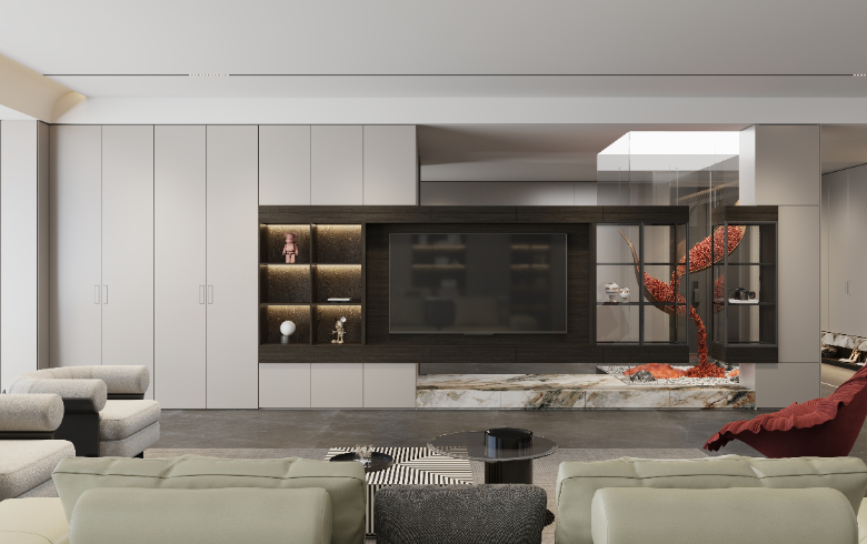 奶白色背板搭配深色開放格,輕鬆打造高級感電視背景牆;底部懸空放置植物與擺件,讓業主在閑暇之餘,感受到空間帶來的呼吸感。