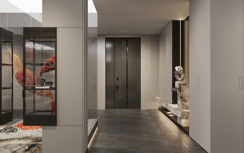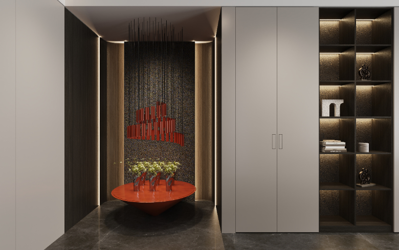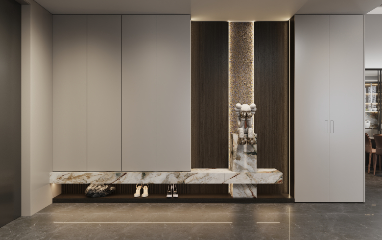 通頂玄關櫃橫向延伸,收納翻倍。底部懸空方便換鞋,提升入門整潔度,地台加持,高級加倍;中部鏤空開放,擺設飾品,放置出門必備物,生活的並井有條從歸家開始。
