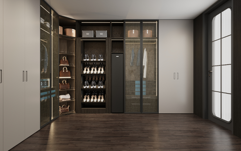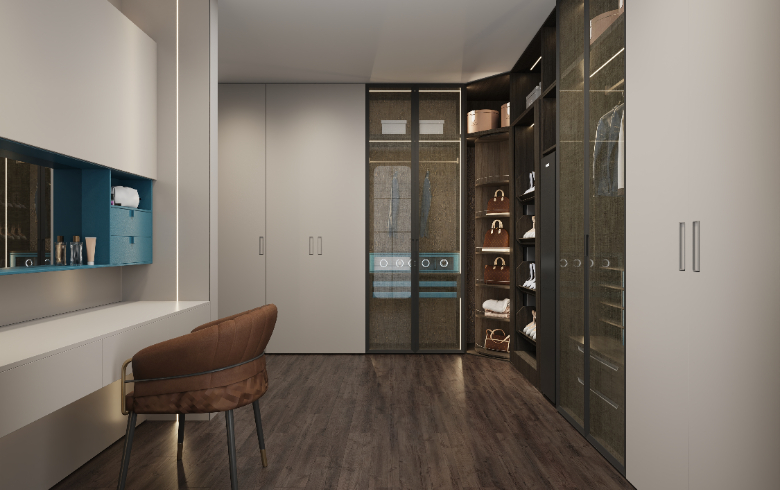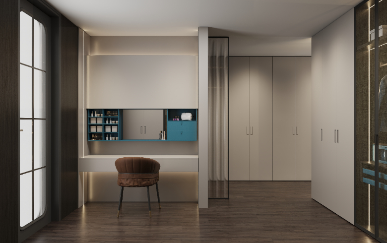衣帽間設置梳妝台,模塊化功能分區,秩序井然,兼具實用性與視覺美,新穎別致的開放格設計,滿足Amy放置常用的護膚化妝品。