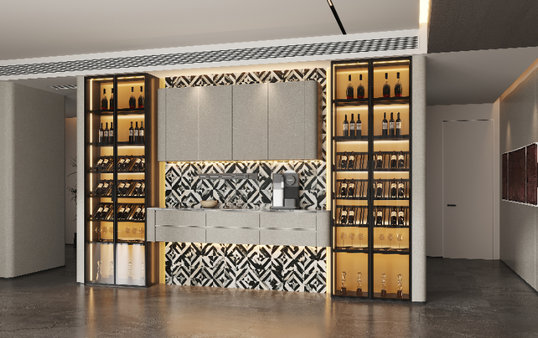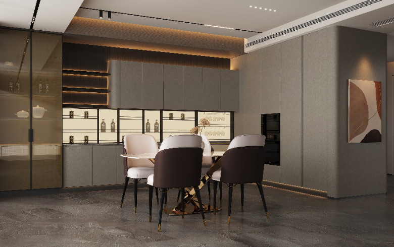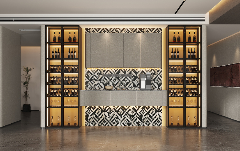 一字型餐酒櫃,左右對稱,吊櫃+中部鏤空區,藏酒區與收納置物區兼得,3D打印裝飾畫背板融入隱形燈帶,調和視覺,打造業主宅家社交場。