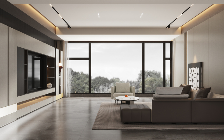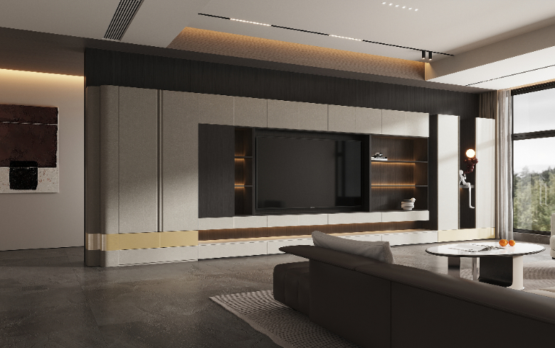 一字型滿牆電視櫃,滿足收納與展示,視覺上更有連貫性。