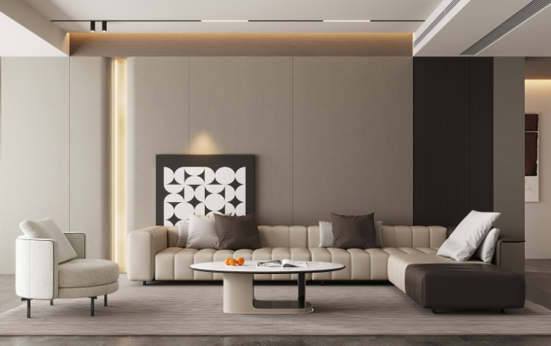 撞色沙發&輕量茶幾,坐臥皆可,精致舒適,是 COCO治愈疲憊的“躺平”寶地。