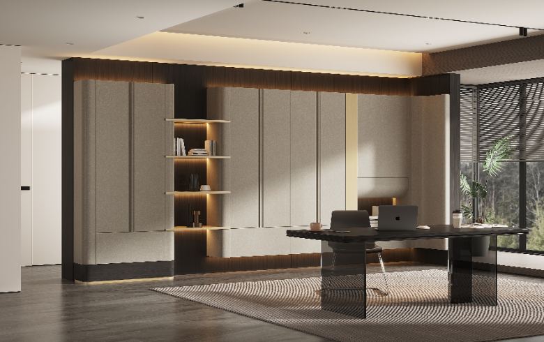 一側設計成懸浮書櫃,輕盈時尚,打破整牆書櫃的厚重壓抑感,讓學習工作更輕鬆有趣。