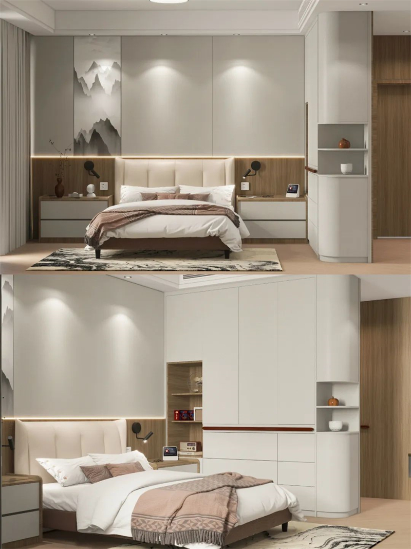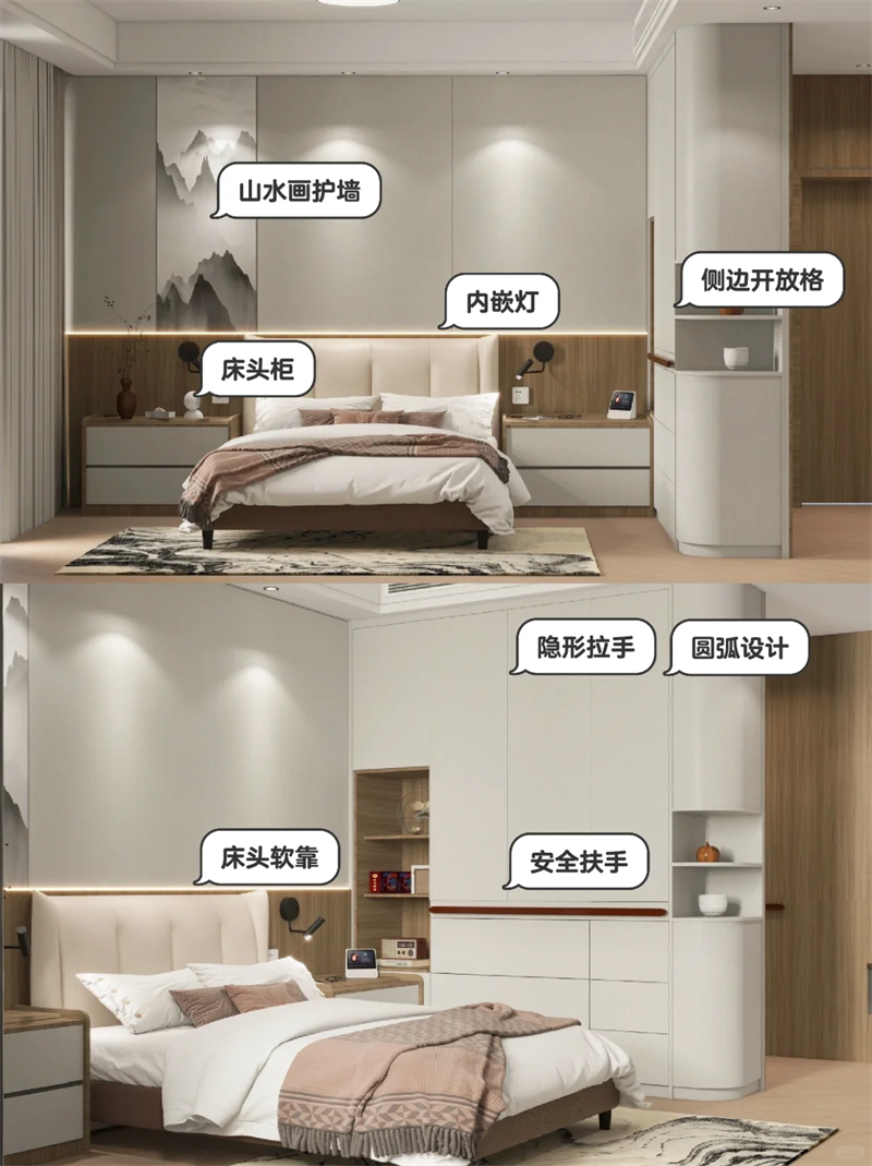 ▪️床頭護牆板融入山水畫,更符合爸媽審美,裝內嵌感應燈,方便夜間起床。