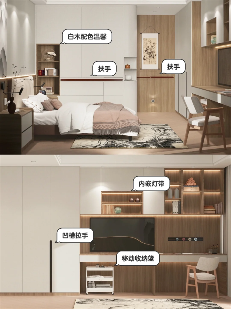 ▪️在衣櫃門和進門牆麵增加了扶手設計,老人行動有支撐更加安全便捷。