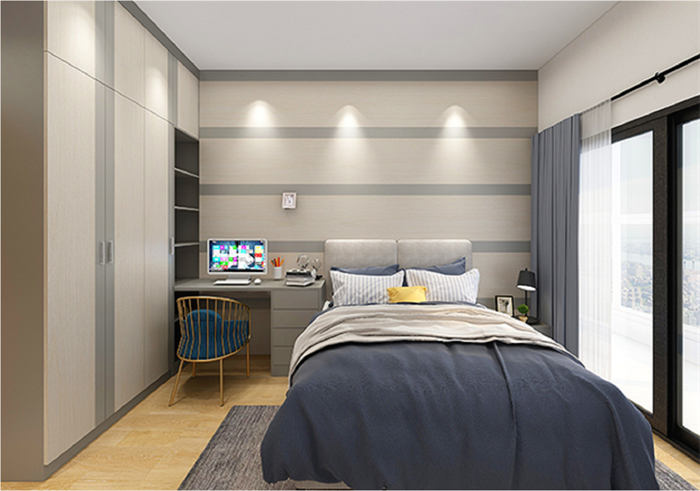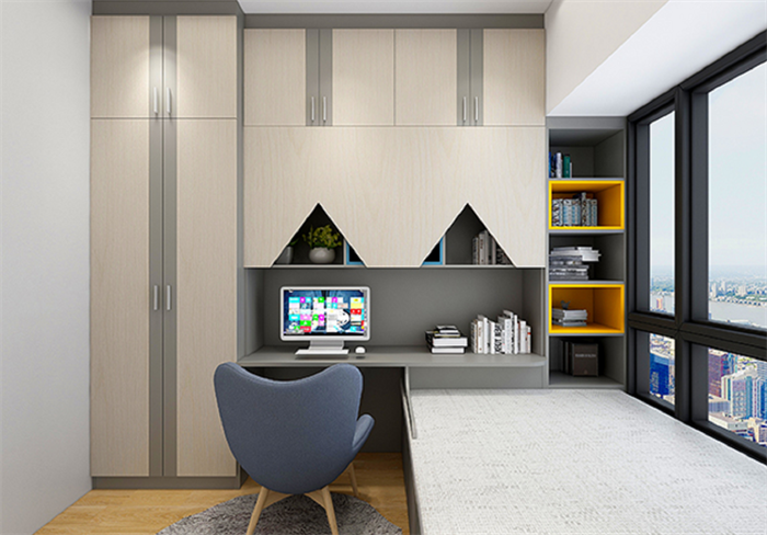 臥室有一個超大肚量的衣櫃,高度直接到頂,寬度占據一整麵牆,衣櫃+書桌書櫃一體設計,收納衣物、寫字看書學習都有了。