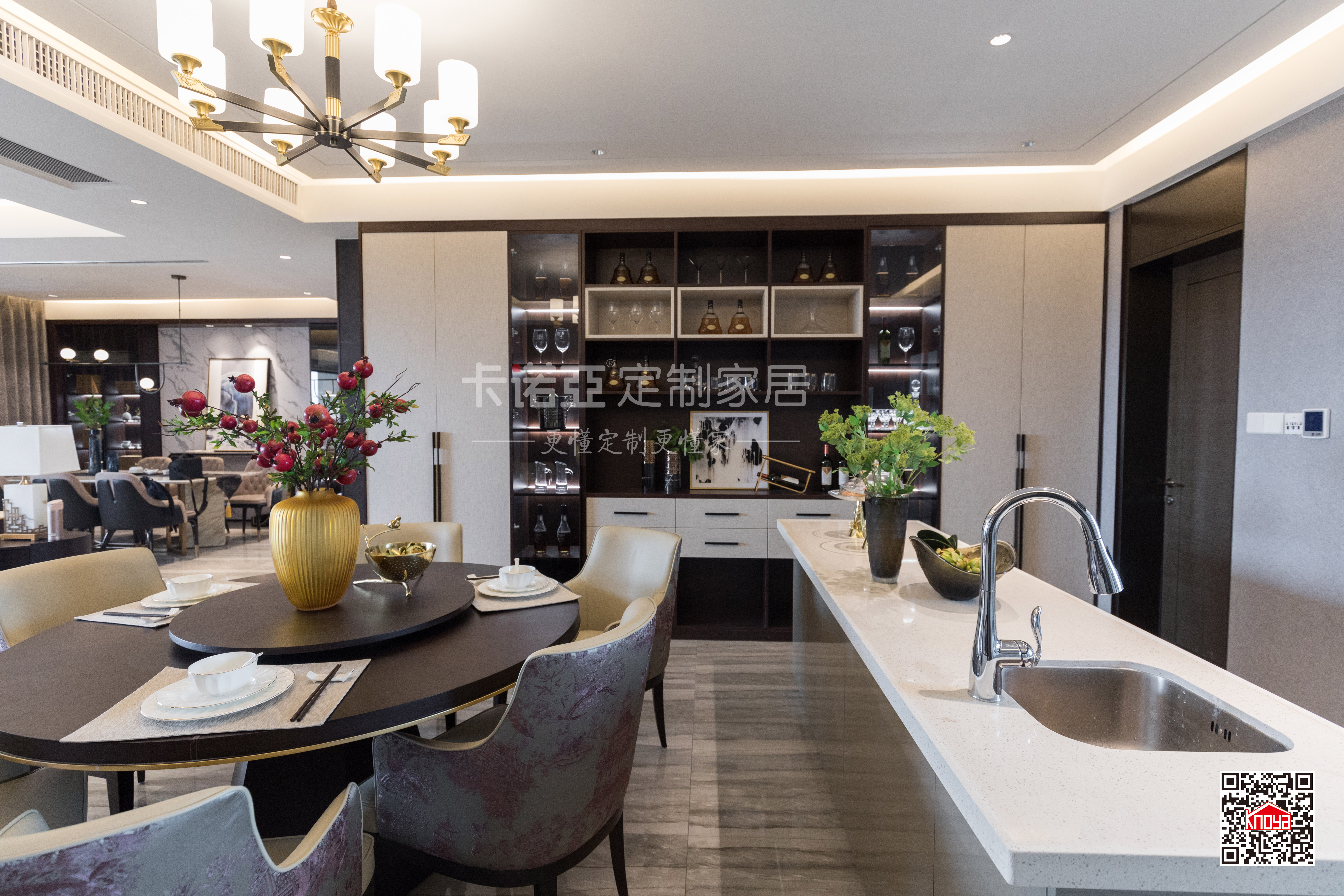 軟裝:扶手餐椅YT-1051a-2、1.5m圓餐桌YT-1050b-2、0.8m轉盤YT-1050b-8、吊燈96035-8、掛畫STS(158)、藝術畫LT-17070289、酒杯、醒酒器、酒具、酒架、仿真綠植、花藝、餐具等