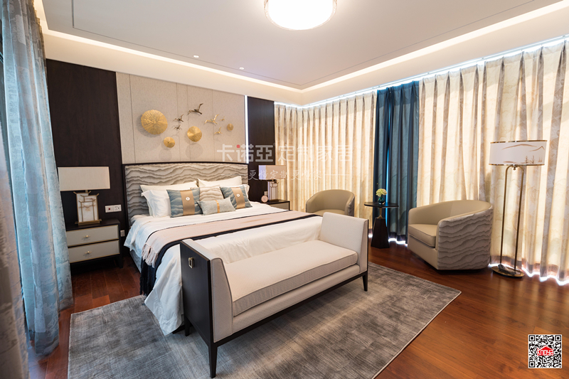 軟裝:1.8米床GC1808、床頭櫃GNS136、床墊、邊幾T1309、單人位矮拚MT-1823、書桌D19274、書椅3352、窗簾CL073、衣物護理機、吸頂燈6216C2-LED、床品SJT006、花藝、台燈、書架、地毯、台燈、長方形雙管籃、裝飾畫、收納箱等