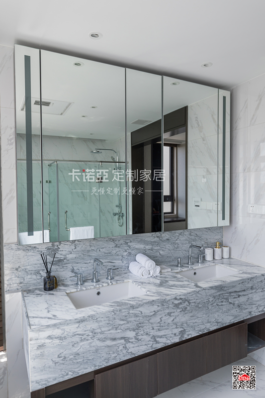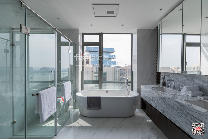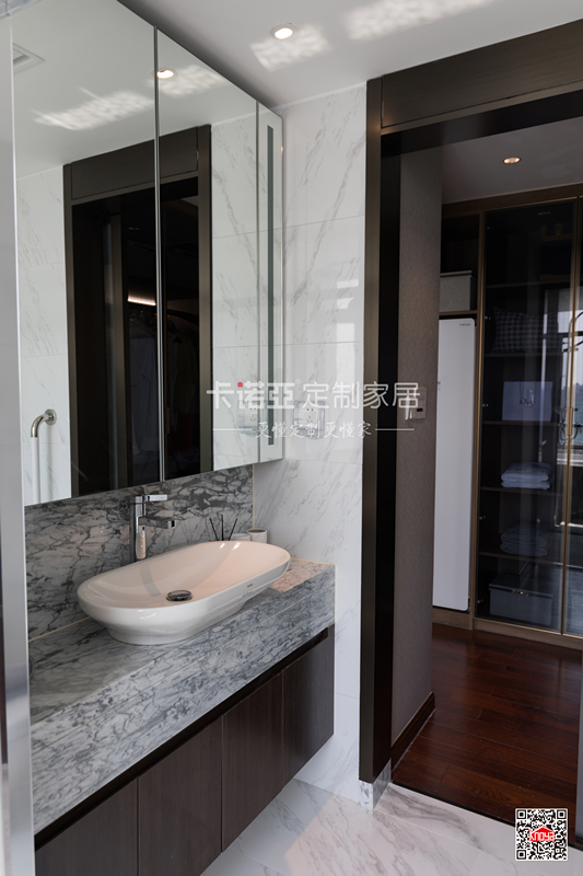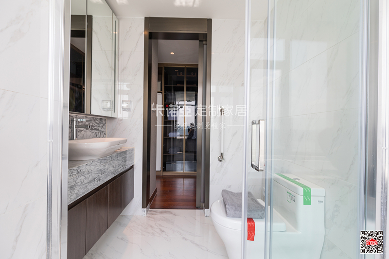 深色浴室櫃體點睛,加上大麵積玻璃的使用,衛生間大氣明亮,空間通透開闊。