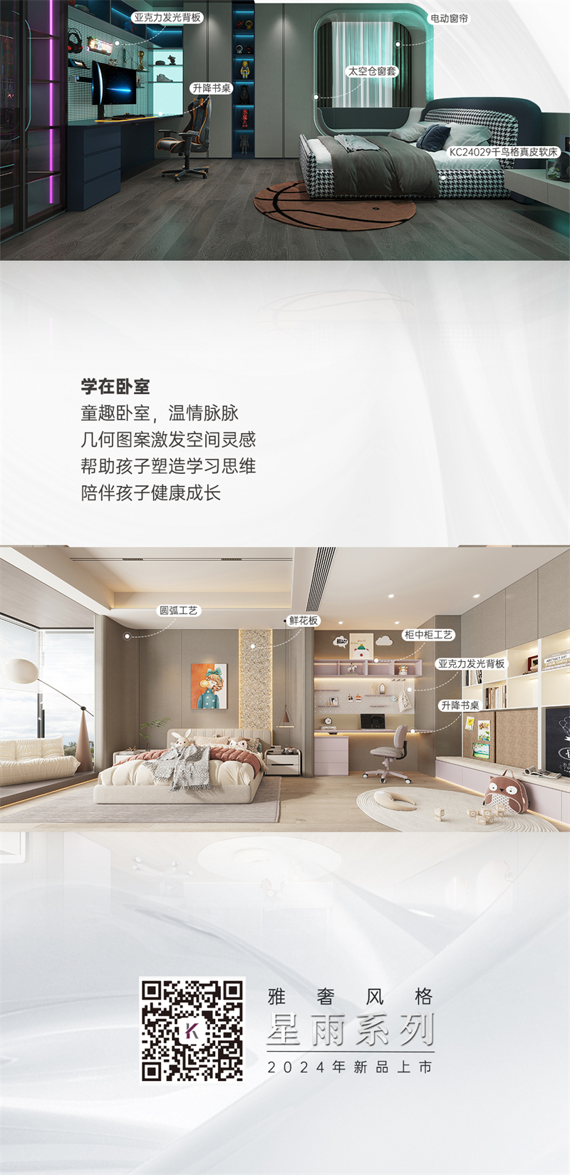 2024年新品係列,星雨 |雅奢風格 該係列產品采用柔和的色彩搭配和浪漫的元素點綴,打造溫馨浪漫的家居氛圍。學在臥窒:童趣臥室,溫情脈脈,幾何圖案激發空間靈感,幫助孩子塑造學習思維,陪伴孩子健康成長