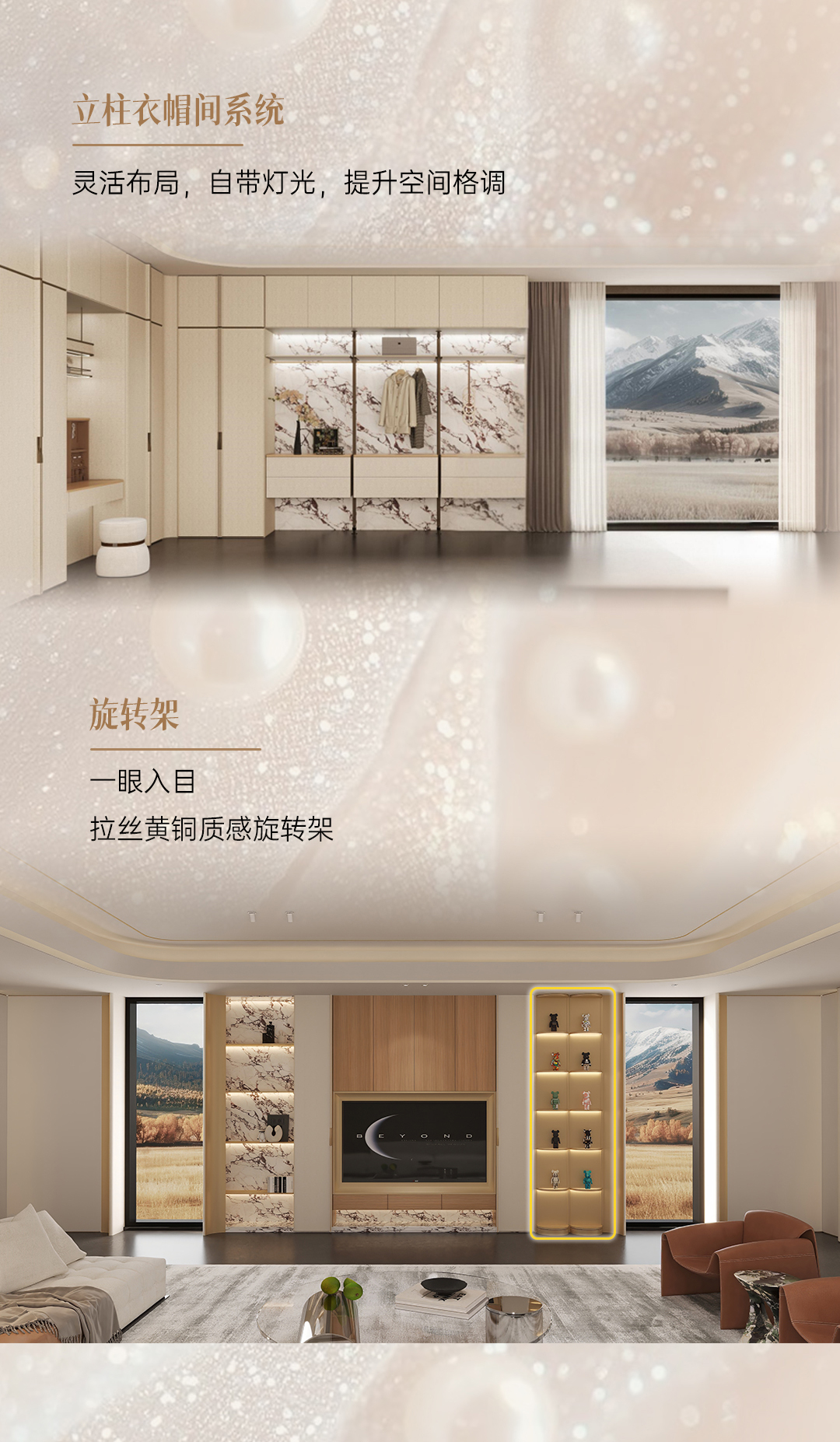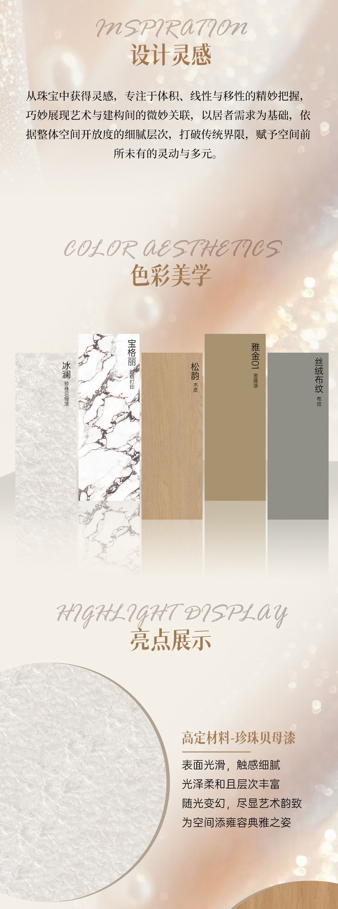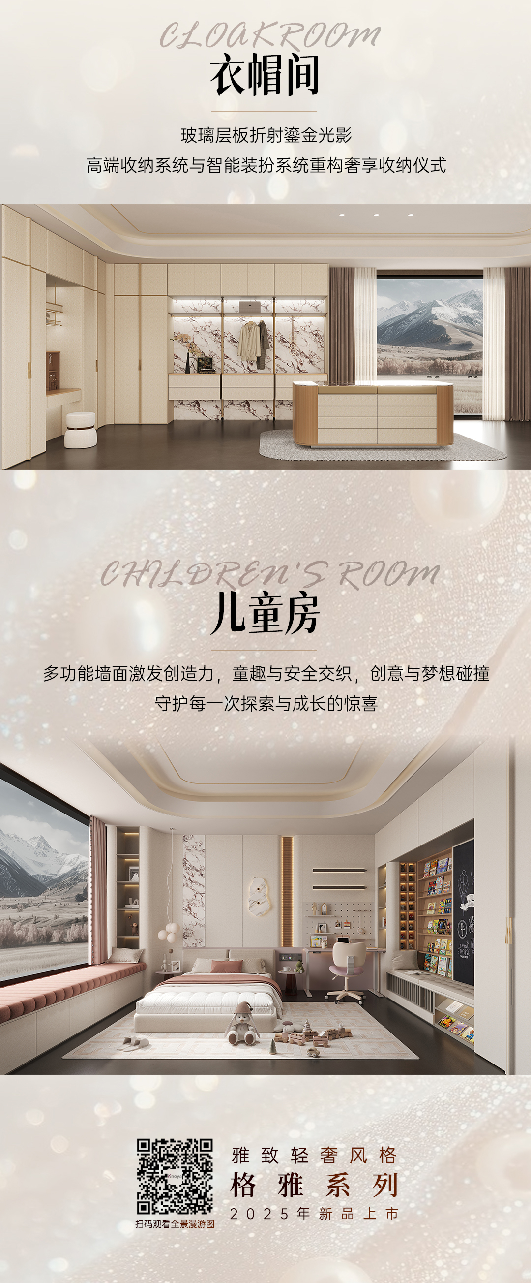 2025年新品係列,格雅係列 |雅致輕奢風格從珠寶中獲得靈感,專注於體積、線性與移性的精妙把握,巧妙展現藝術與建構間的微妙關聯,以居者需求為基礎,依據整體空間開放度的細膩層次,打破傳統界限,賦予空間前所未有的靈動與多元。人群定位:30至45歲藝術家家庭,對生活品質持有極致追求