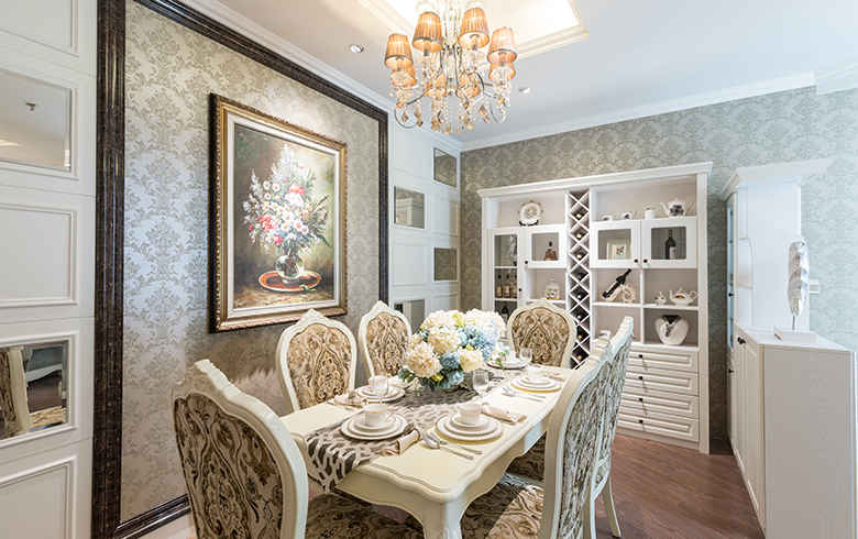 餐廳充盈著白色的純粹,如初戀般純淨與美好,橡木錯落有致的紋理,帶來別樣精致的質感。家具中流暢線條的寫意設計,看似隨意刻畫的簡歐風情卻表達得恰到好處。