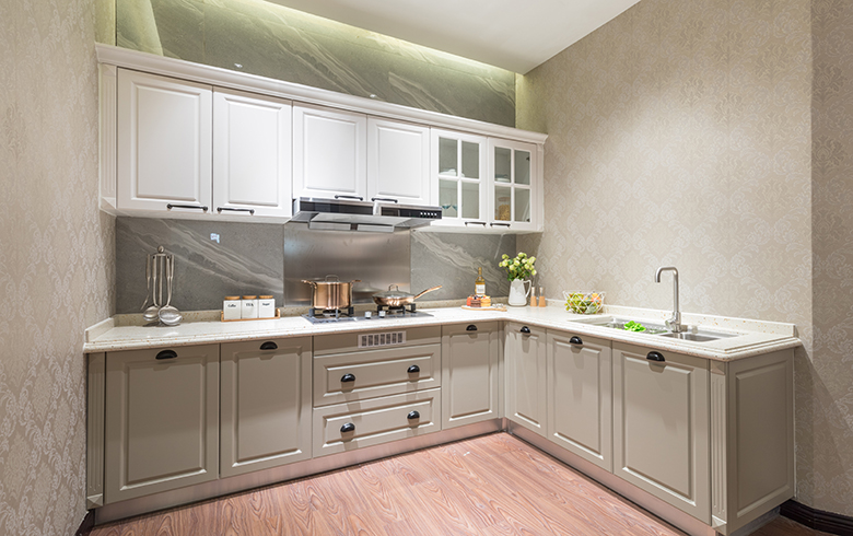 廚櫃采用白色和淺灰色為主要配色,烘托空間的優雅氣質。歐式淺色印花牆紙,與廚櫃門板既相互融合,又能體現出層次間的落差美。