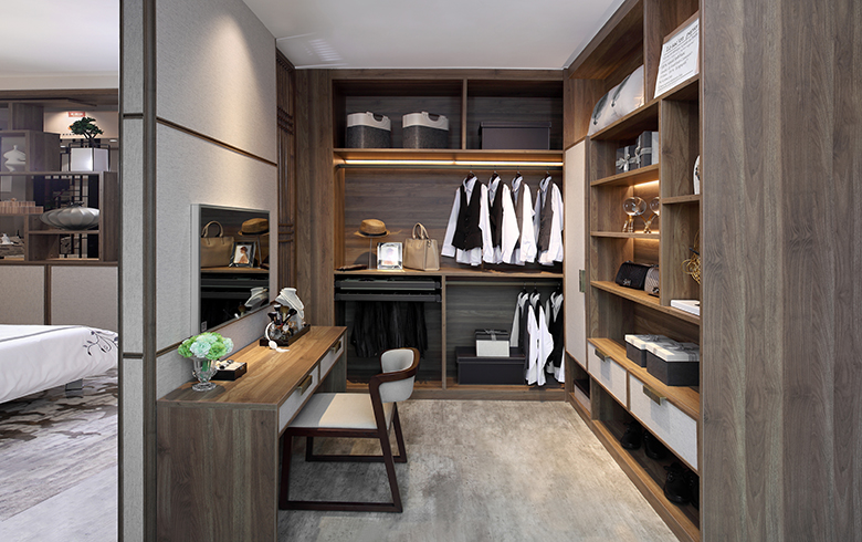 設計上順應趨勢,去掉多餘的衣物掛放區,增加擺放展示區,凸顯衣帽間的實用功能。兼顧功能與美學的設計宗旨,實現香蕉视频黄色版、衣帽間、化妝間三合一功能空間。
