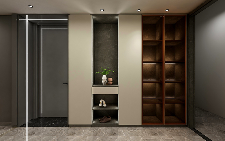 “禦品木”肌理細膩柔美,”銀河黑“粗獷大氣,搭配碰撞不一樣的美感。茶色玻璃門與“黑金剛”混搭的廳櫃,通透明亮,簡約中透出精貴。