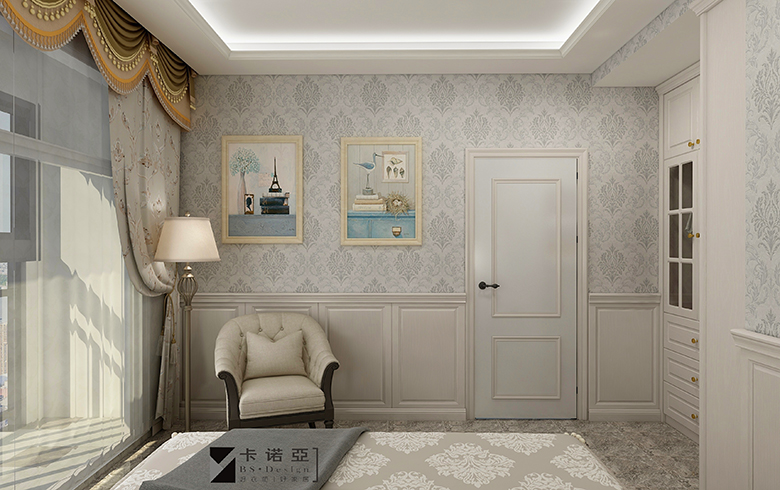 高原雪橡天然素淨的白,營造出極為潔淨素雅的家居環境,牆裙式護牆設計與歐式紋飾的壁紙、同色到頂衣櫃融為一體,結合精致的吸塑造型、素雅的軟裝配飾、歐式造型窗簾、西洋掛畫,輕鬆營造出純淨、美好的簡歐家居氛圍。