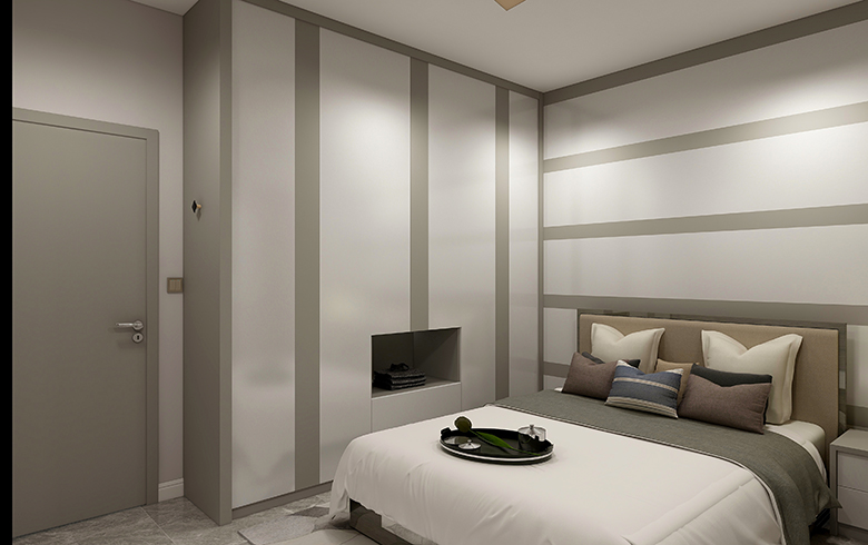 采用尼泊爾柚木+深灰風之穀的撞色創意搭配方案,色係深淺結合,空間線條感及幾何造型強烈,既不顯得單調,又具空間層次感。