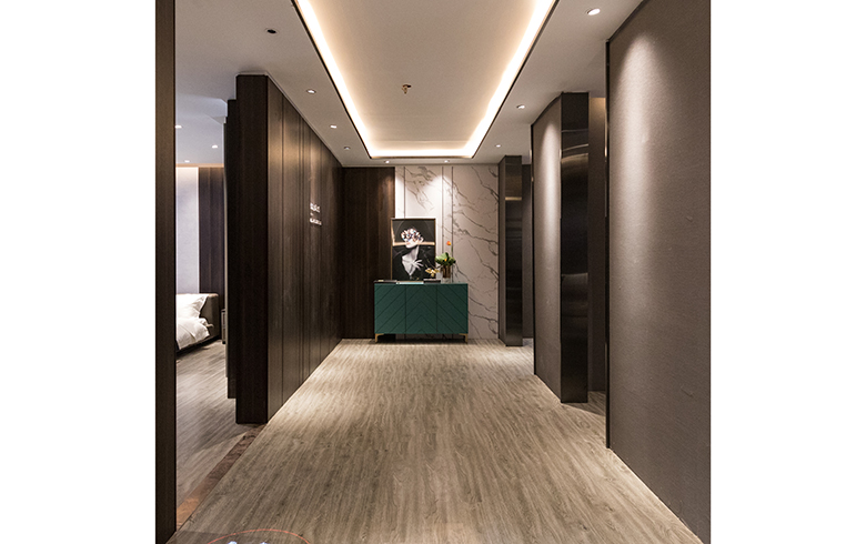 護牆係統采用漢白玉及深木色混搭的護牆板,漢白玉的簡潔明快,搭配不失溫情的木色,中間扣線的簡單切割拚接,統一中有變化,低調中帶點小清新,製造出時尚輕奢的生活美學。