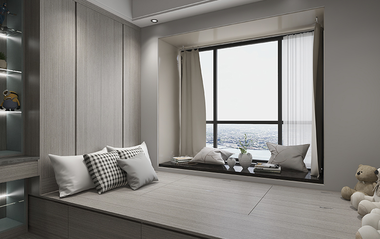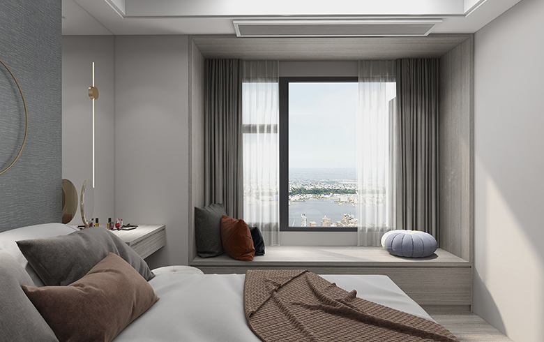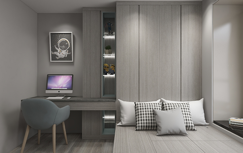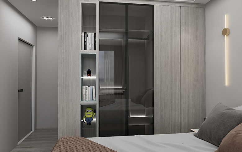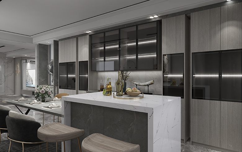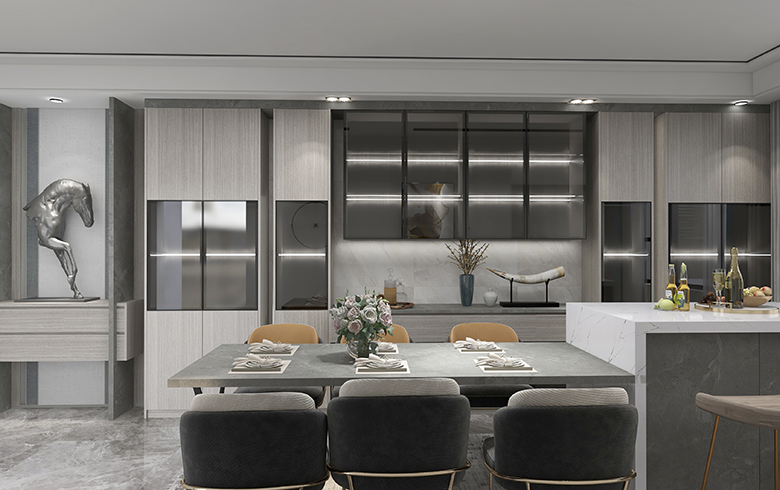 本案的簡約現代風格,擯棄所有的繁瑣,加上一些幾何圖形元素,以簡為主,將舒適清雅的氛圍裝進簡潔利落的空間。打造出一個通透明淨、清新雅致的現代空間。整個空間以暖色為基調,讓人倍感舒適溫馨,搭配淺色沙發,在定製家居中搭配黑框玻璃門及玻璃層板燈,在良好的采光下營造出透亮潔淨的視覺感受。而在空間處理上,采用開放式處理,減少空間壓抑感,同時加以深色大理石紋板材作為細致的點綴,賦予空間一抹藝術氣息。