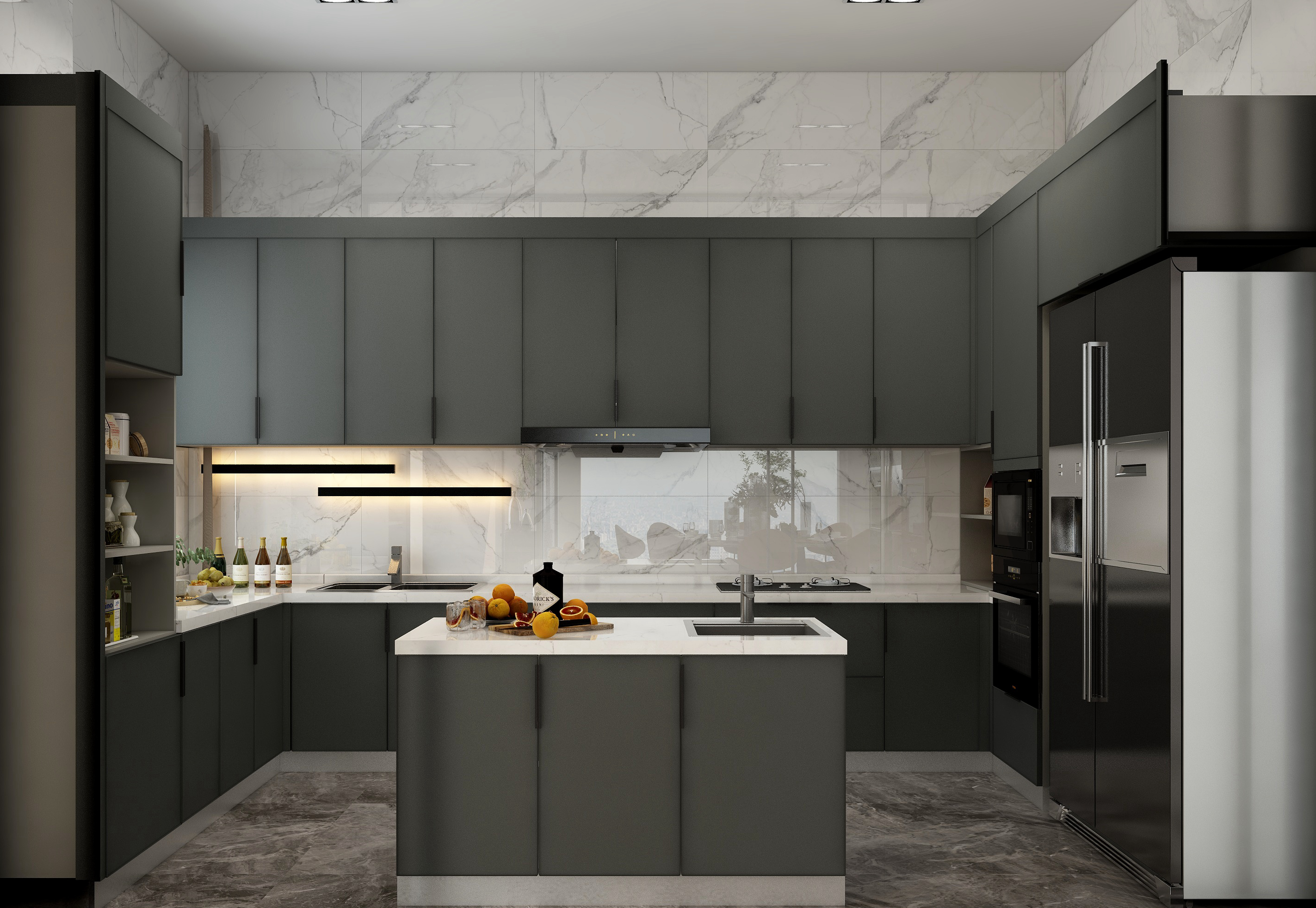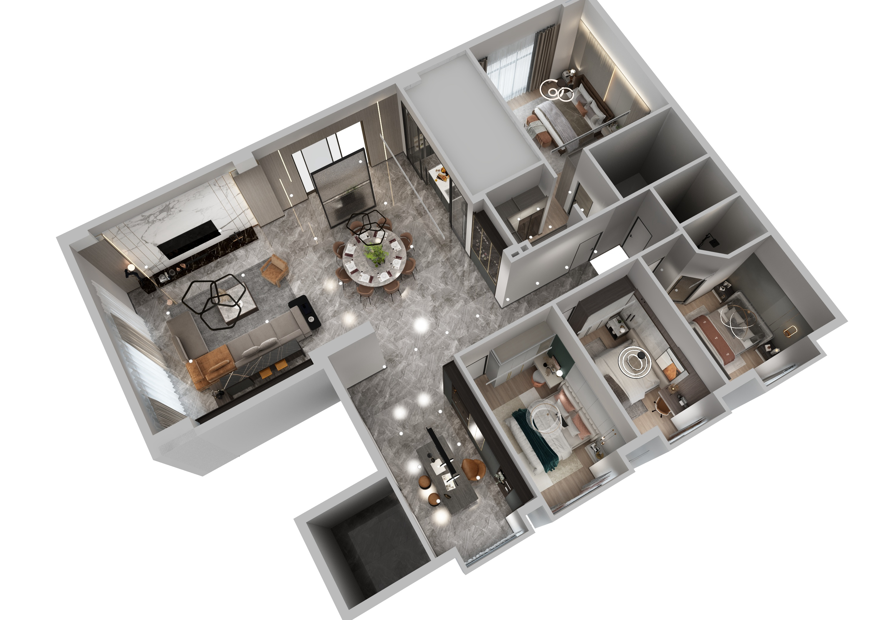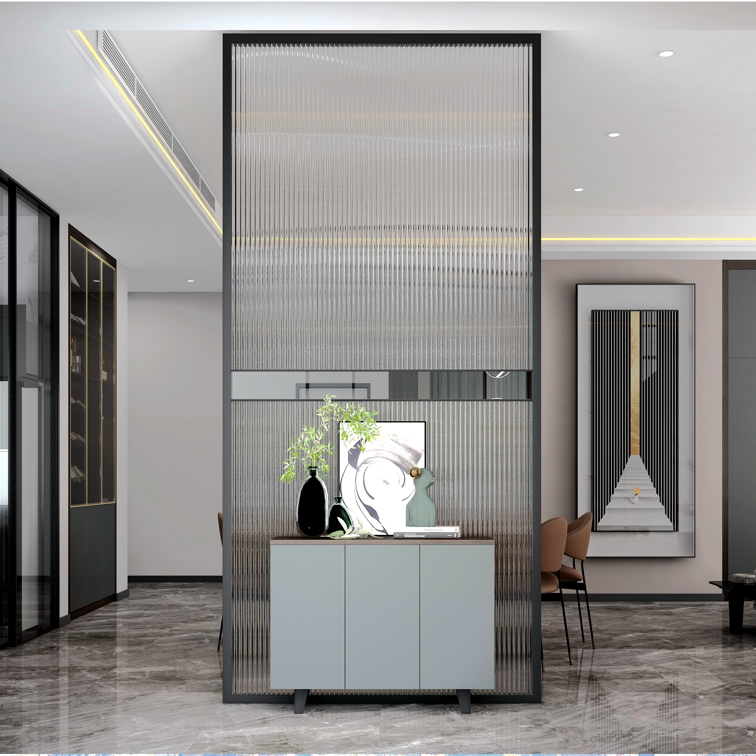 在接近夜幕時刻的傍晚,天空還帶著微微的晚霞,天空是霧蒙蒙的,泛著暖暖的光,暮色刻畫出來的棱角,不像深夜那麽模糊,不像白天那麽清晰,有一份恰好的柔和感又有一份溫柔的醉意。而我門這次方案的構思,將設計方案定義為極簡風格,保留著黑白灰本有的色塊分明度,在色彩元素上增加了一些暖色調,在材質提現上摻入一些絲絨磨砂柔軟觸感的質感搭配,緩和黑白灰的線條感,讓冷峻的空間感多一點生活的煙火氣息