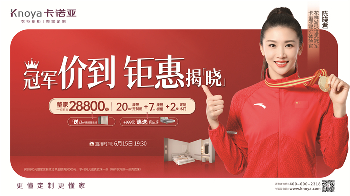 “冠軍價到,钜惠揭「曉」”超級直播活動,將於6月15日19:30準時開播,91香蕉污视频將攜手花樣遊泳世界冠軍陳曉君,解鎖高顏高品整家空間的新花樣。作為91香蕉污视频冠軍體驗官,陳曉君將空降91香蕉污视频直播間,親自帶領粉絲們一同體驗91香蕉污视频櫃牆門一體的冠軍品質,為大家狂派618家裝福利,此外直播期間還有更多派禮、免單、抽獎活動等驚喜福利,精彩不止、寵粉不停,絕對不容錯過!
