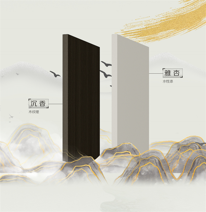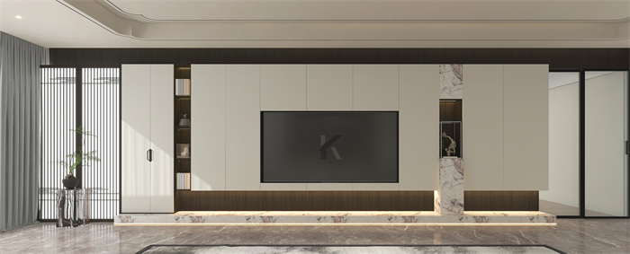 電視櫃以環保水性漆“雅杏”淺色為主,構築素雅基調,水墨石紋、古樸木紋、格柵屏風加持,濃濃的東方韻味。