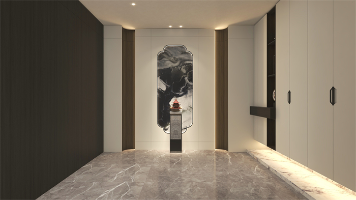 門廳:新中式元素“奢石”地台作為點綴,開啟新國潮視覺盛宴。護牆板燈帶勾勒出簡約的宮燈形狀,與右邊櫃門的燈籠造型拉手遙相呼應。對稱式圓弧轉角,將護牆板與玄關櫃柔美連接,渾然一體,自然天成。