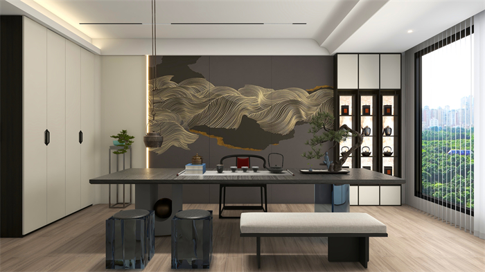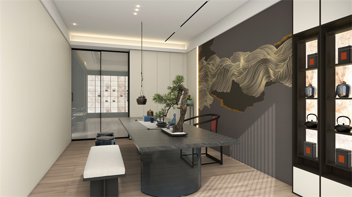 茶室:打破傳統對稱均衡,一側一門到頂封閉櫃,一側半開放式設計,既彰顯東方韻味,又為視覺做減法,簡單大雅。玻璃的通透與木紋的肌理相互交融,剛柔相濟,精致而高級。