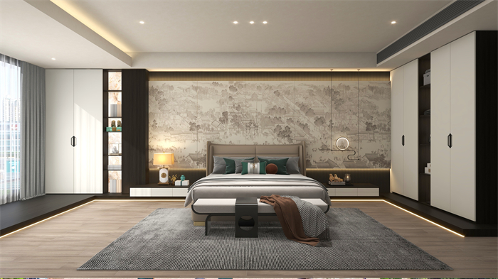 主臥:衣櫃及床頭櫃采用對稱式設計,與圓形燈裝飾掛件形成了方與圓的空間禮序,多處鏤空設計展示朦朧透視的詩意想象。床尾凳實用與顏值兼備,要穿的衣服可以放在這裏,還可充當早餐椅,就著陽光,吃著早餐。深色U型地台將淺色櫃體抬起,收納與顏值兼備,3D錯落增加懸浮感,搭配古風市井畫,夢回千年古都。
