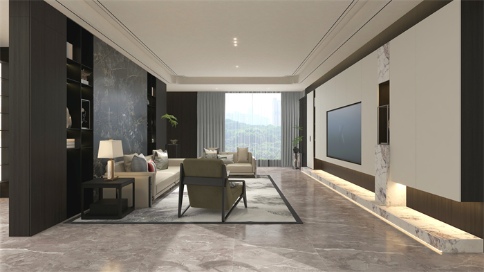 沙發背景啞黑鋁板櫃對稱設計,與深色“沉香”完美契合,遇見東方禮序之美,木紋、石紋、鋁板,傳統與現代材質碰撞彰顯層次感,搭配國風家品,更顯東方意境。