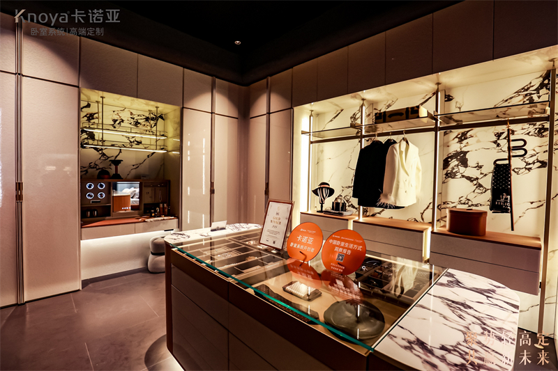 格雅係列從高級珠寶中淬煉靈感,以雅致輕奢為核,用珍珠貝母漆的流光、拉絲黃銅的肌理、形變雕塑拉手的藝術張力、木皮拉槽的凹凸有致,為30-45歲都市新貴定製功能多元化的“藝術容器”。豪華遊艇舷窗式結構打破傳統空間的方正,發光層板與榆木木皮形成冷暖對話,戒指線條門型暗喻永恒承諾。這一係列以建構主義手法,將藝術基因注入實用主義,實現從產品定製到生活方式定製的蝶變。