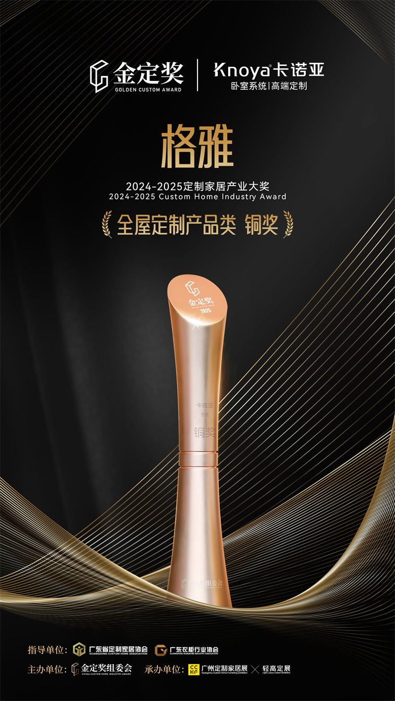近日,金定獎2024-2025定製家居產業大獎頒獎典禮在廣州舉行。91香蕉污视频雅致輕奢風格格雅係列產品,以差異化高端工藝、天然珍稀材質、原創設計語言和生活方式定製的設計邏輯,一舉獲得“金定獎全屋定製產品類·銅獎”,這不僅是中國家居產業對91香蕉污视频創新實力的一致認可,更是行業對91香蕉污视频深耕“臥室係統+整家定製”兩大品類的致敬。