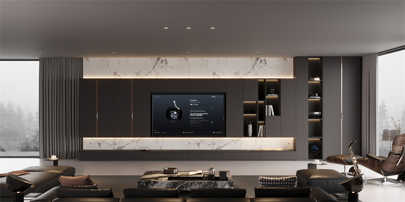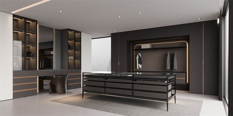 ·材質對話:直紋肌理板材與澀黑櫃體形成深淺對比,數碼打印出來的紋理如大理石般通透,鋁木玻璃櫃將金屬堅韌與木材溫潤完美結合。
