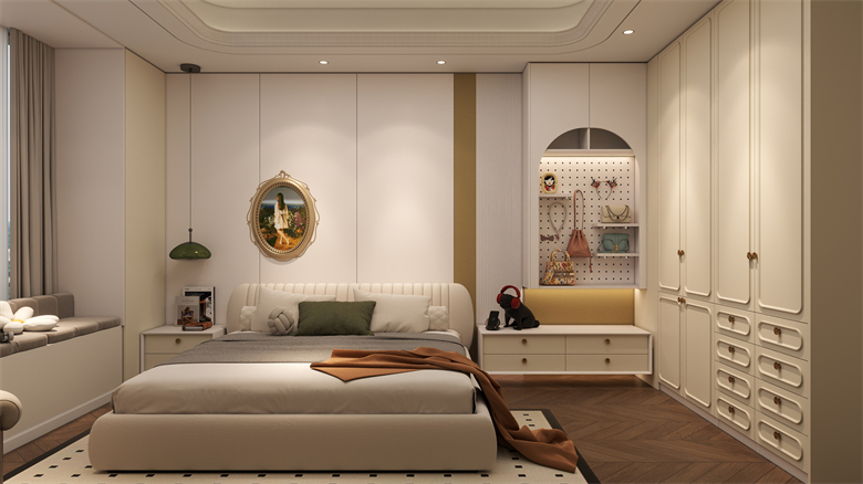 在這裏,護牆板的柔和線條與懸浮式床頭櫃的輕盈設計,為你打造出如詩般寧靜的休憩空間。整牆衣櫃以香頌白為主色,搭配奶油色床品,讓晨起或睡前,每一眼都是治愈。