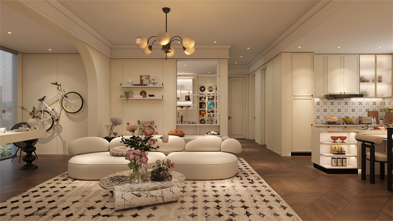 香草奶油主調營造出溫柔的空間基調,電視櫃與餐邊櫃采用香頌門型設計,通過吸塑工藝呈現優雅流暢的曲線,為空間增添一抹靈動的韻律感。開放式布局巧妙串聯起家庭生活場景,在通透的空間中詮釋著法式家居的精致美學。