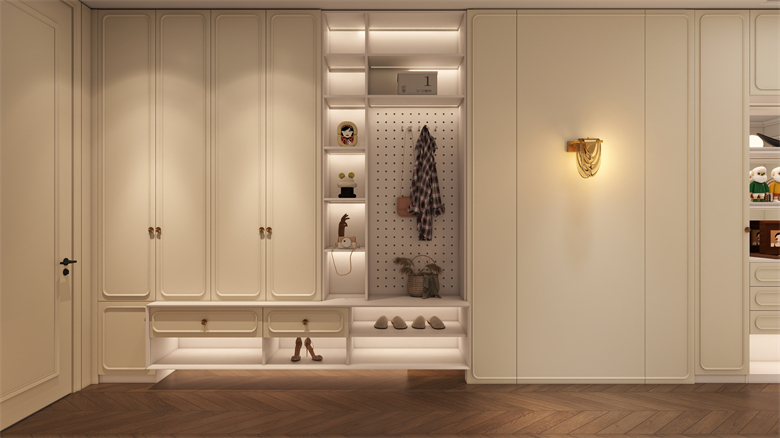推開門的瞬間,羅亞用香頌白的櫃體營造出如巴黎公寓般的迎賓氛圍。法式的線條營造溫馨浪漫情調,以獨特和優雅的方式融合古典與現代風格。法式線條勾勒的玄關櫃不僅滿足收納需求,更讓歸家成為一場視覺享受。