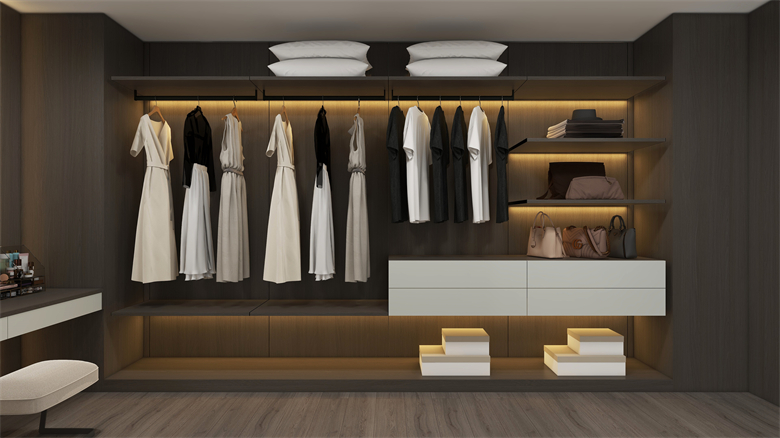衣帽間以極簡疏闊布局,楓沙木、生椰灰與榛果咖搭配,讓衣物、鞋子被溫柔對待,挑選穿搭成了 “欣賞小確幸” 的過程。羅亞全屋定製用 C 調係列證明:好的定製讓家與生活同頻,其 “懂設計,有顏值” 的背後,是對年輕人生活態度的尊重與品質的堅守。