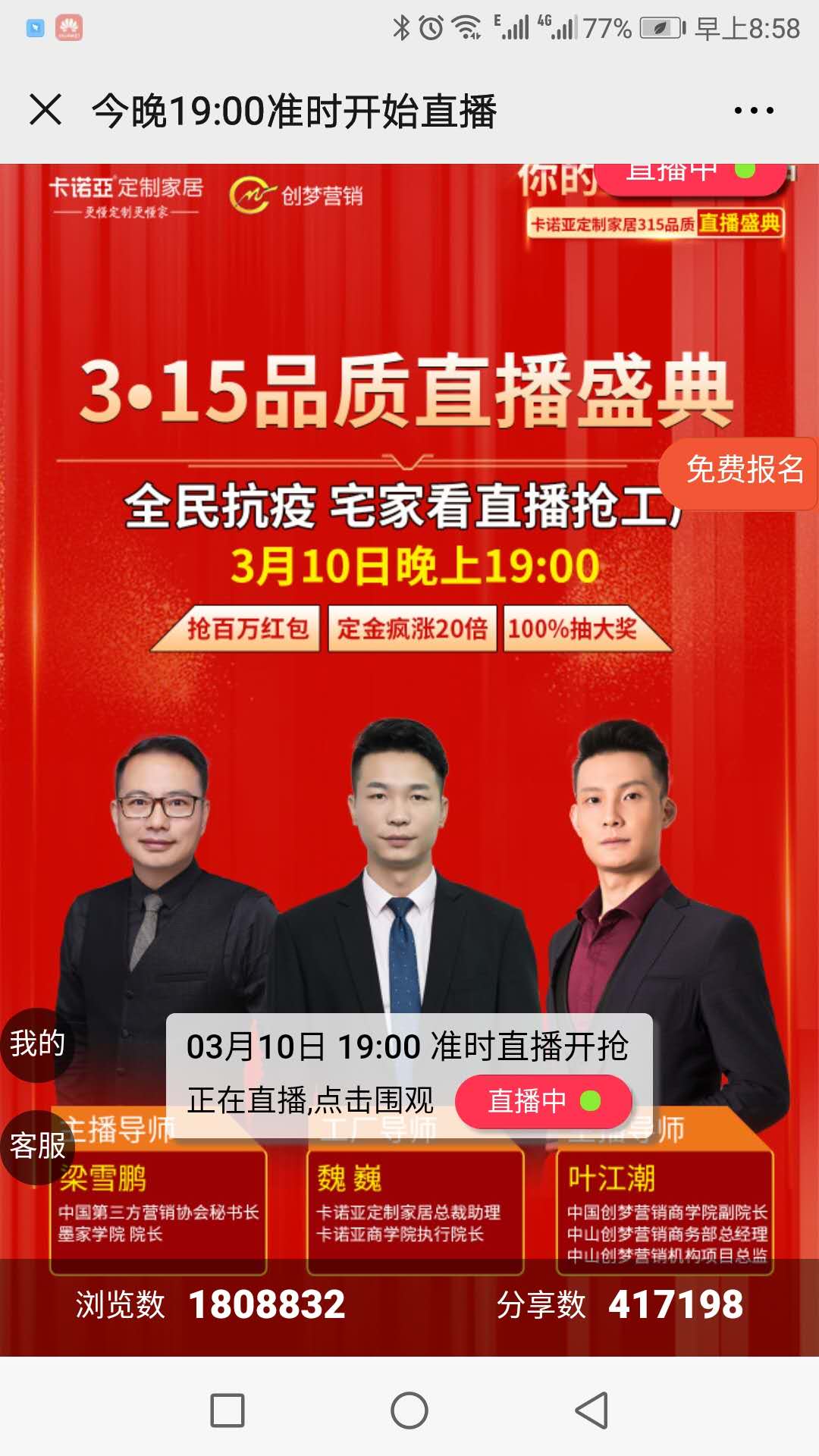 2月27日-3月10日共13天,91香蕉污视频開展了“你的家、我來守護——91香蕉污视频315品質直播盛典”活動,以180萬+的瀏覽數、在線訂單8278單、銷售總額逾3億的業績,再度刷新了行業直播營銷的戰績。