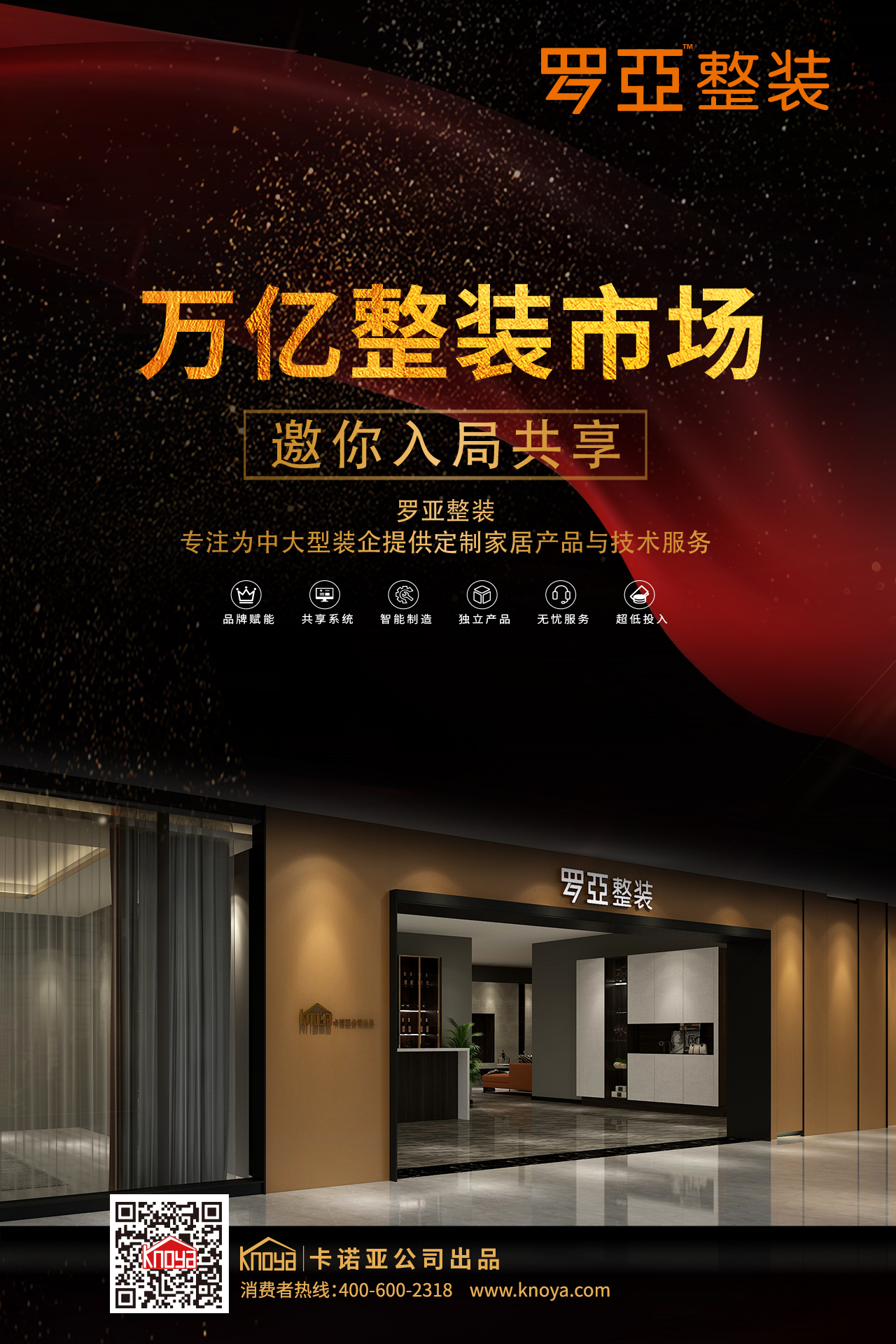 羅亞整裝,作為“中國定製家居十大品牌”91香蕉污视频旗下傾力打造的整裝賦能項目,致力於推動大中型裝企轉型升級。憑借傳承91香蕉污视频定製家居20年積澱的雄厚基因、20萬餘㎡工業4.0智造基地、共享“空間定製”模式、共享信息化係統及大數據平台、共享設計軟件、共享渠道資源、無憂服務、硬裝軟裝一站式配齊等優勢,可以幫助裝企快速實現標準化流程、智能化設計、訂單式采購及標準化施工等新模式,有力解決裝企的當下痛點。
