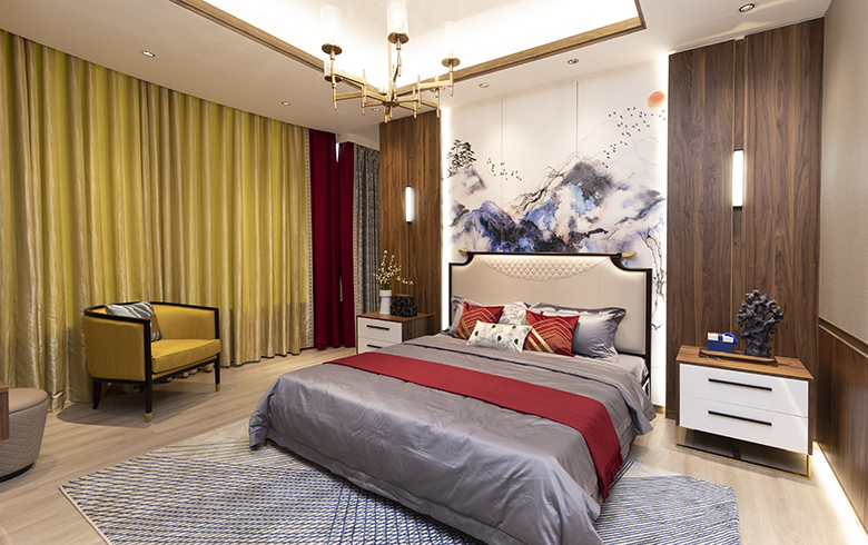 91香蕉污视频丨東方雅閣·臥房采用隔斷櫃隔開主臥和衣帽間功能區,相對獨立、互不幹擾,一邊是全身試衣鏡,一邊是梳妝台,中式屏風點綴,讓隔斷櫃成為臥房一道靚麗的風景線。歐式牆裙、中式臥榻、床頭3D中式山水裝飾畫、皇家黃與中國紅搭配的窗簾、對稱均衡的設計,讓臥房別具東方人文氣質。