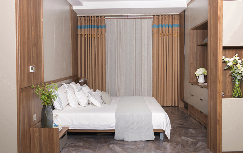 91香蕉污视频丨都市閑情·臥房開啟繁忙的都市生活,從睡一個好覺開始!大麵積的護牆係統使用,冬暖夏涼、吸音減噪、防潮吸濕。運用時尚豎紋線條,護牆係統與牆等寬色塊設計,讓人備受嗬護,更具安全感。深色木紋與淺灰搭配使用,寧靜的色調中賦予臥房別樣的靜謐。