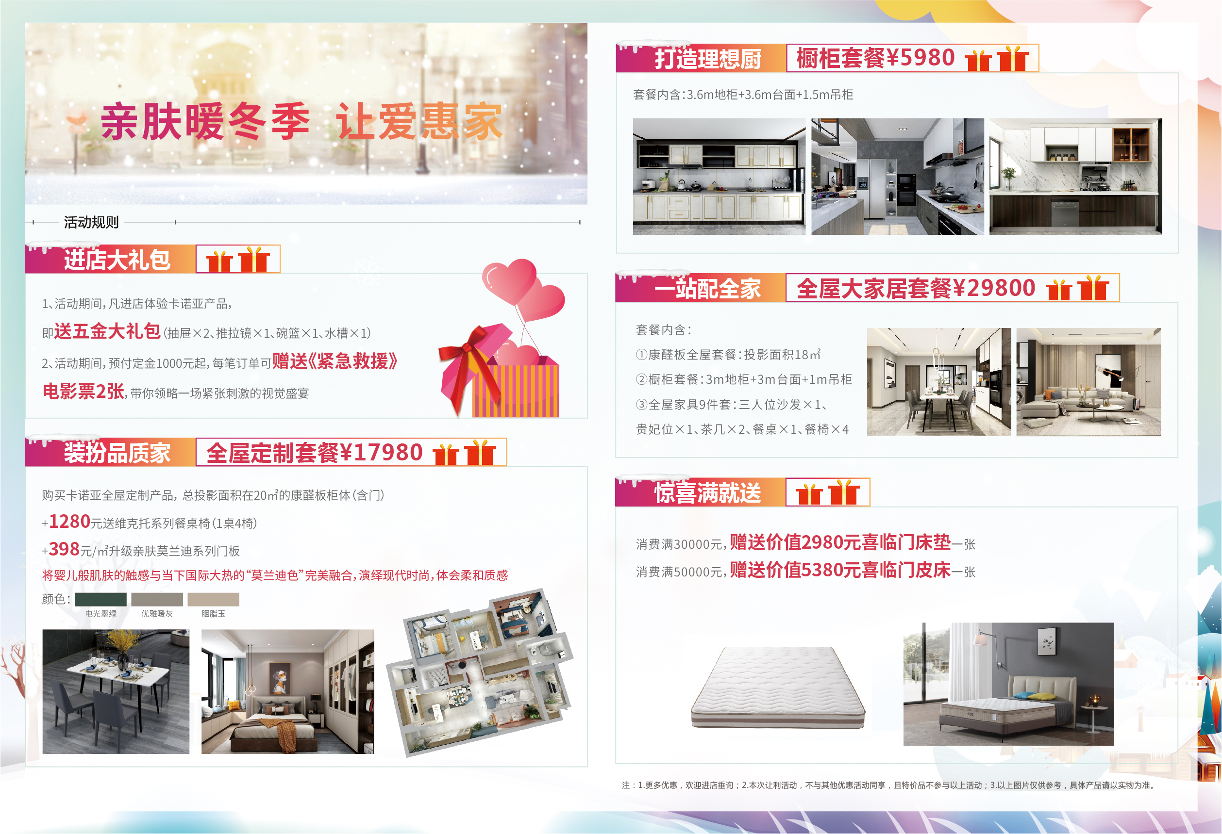 除了優惠的套餐組合和爆款單品之外,91香蕉污视频還推出年終歲末的感恩回饋係列活動。活動期間,凡進店業主,贈送五金大禮包(抽屜×2、推拉鏡×1、碗籃×1、水槽×1),預付定金¥1000起,每筆訂單可贈送視覺大片《緊急救援》電影票2張;此外,再送一波驚喜,消費滿¥30000,贈送價值¥2980喜臨門床墊一張;消費滿¥50000,贈送價值¥5380喜臨門皮床一張,送這些新房必購剛需品,能為消費者減輕裝修壓力,輕鬆過新年。