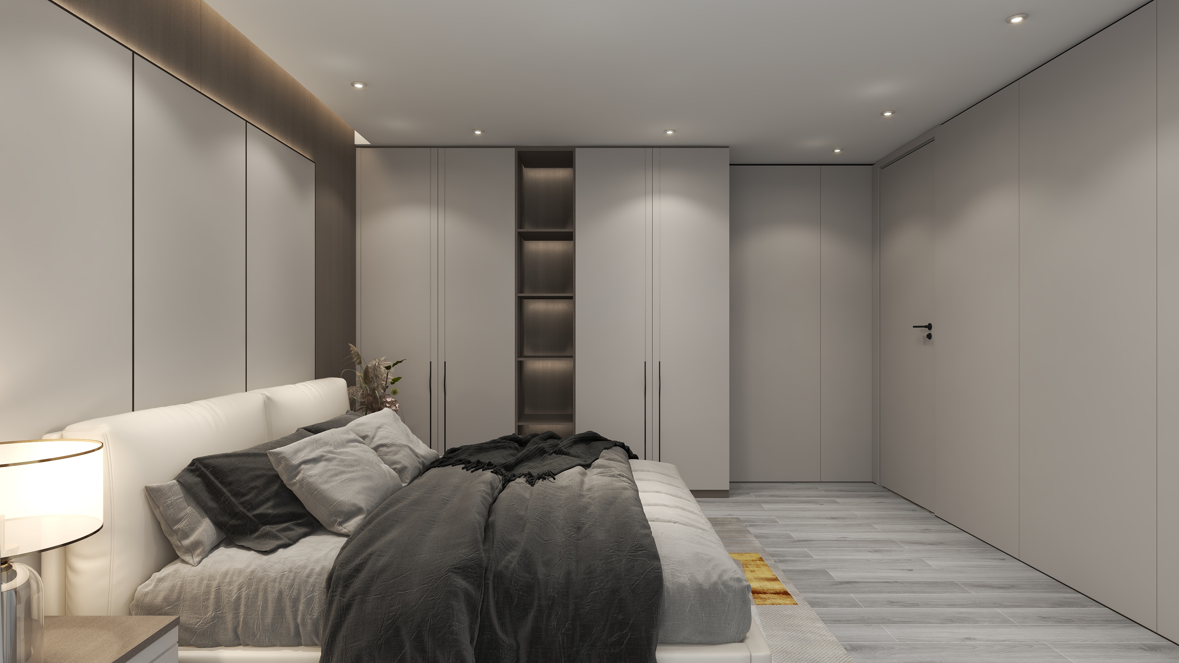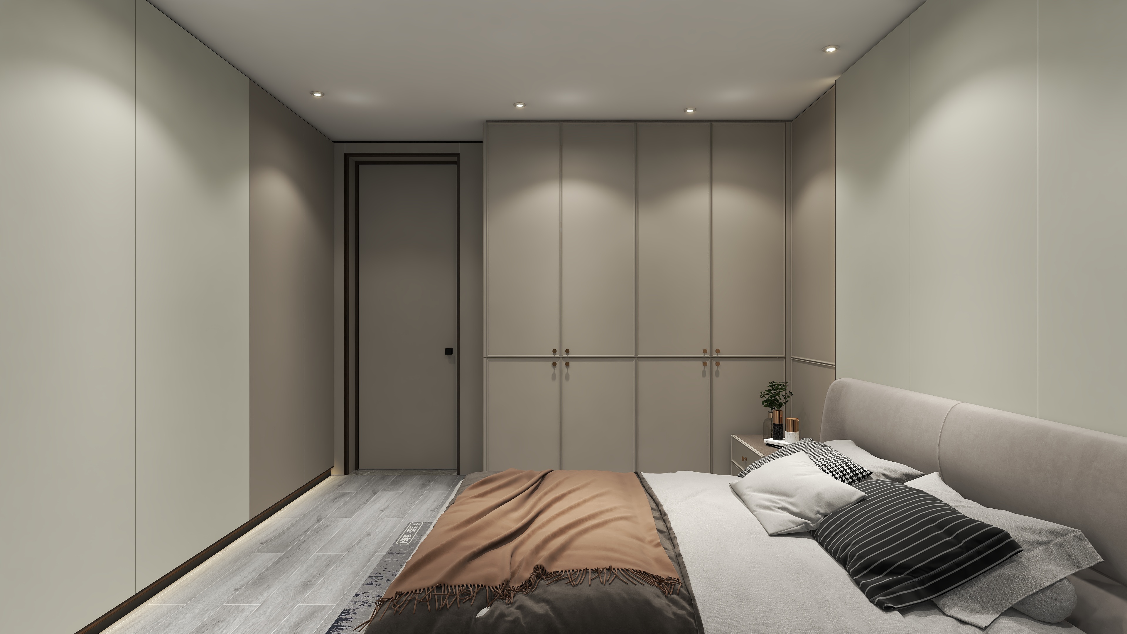 米蘭之吻係列,采用一體式櫃體布局,整體動線順暢開闊。在以舒適為原則的基礎上,臥房護牆板及衣櫃的櫃門采用“嬌月白”與“優雅暖灰”構築靜謐的底色,櫃體采用“流光漫步”花色搭配。衣櫃PVC吸塑櫃門拋棄繁複的歐式紋飾,采用簡歐線型,運用小邊框勾勒出線條靈動之美,一改傳統櫃門一平到底的單調印象。“優雅暖灰”花色打造的格柵立體造型護牆板,自帶高顏值的視覺享受。床頭背景牆隱藏式燈帶漫射暖光,溫馨之外更顯視覺層次感。