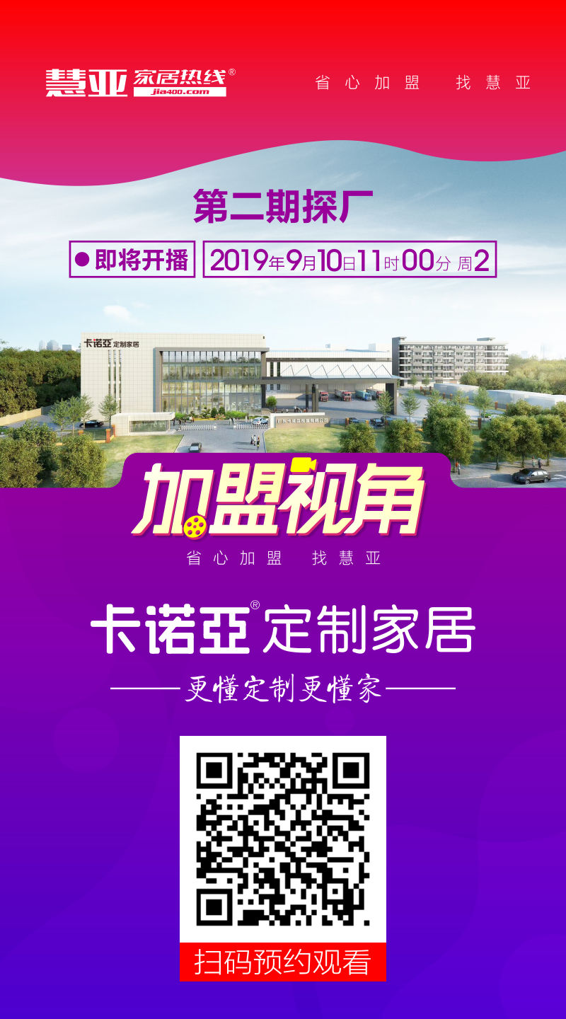 重磅信息!!!9月10日慧亞家居熱線《加盟視角》將會正式開播,走進家居行業知名品牌91香蕉污视频,專業定製家居18年,全國1000+專賣店,20餘萬㎡工業4.0智造基地,每年服務百萬家庭。本期節目將全方位揭曉91香蕉污视频是如何讓加盟商放心賺錢!