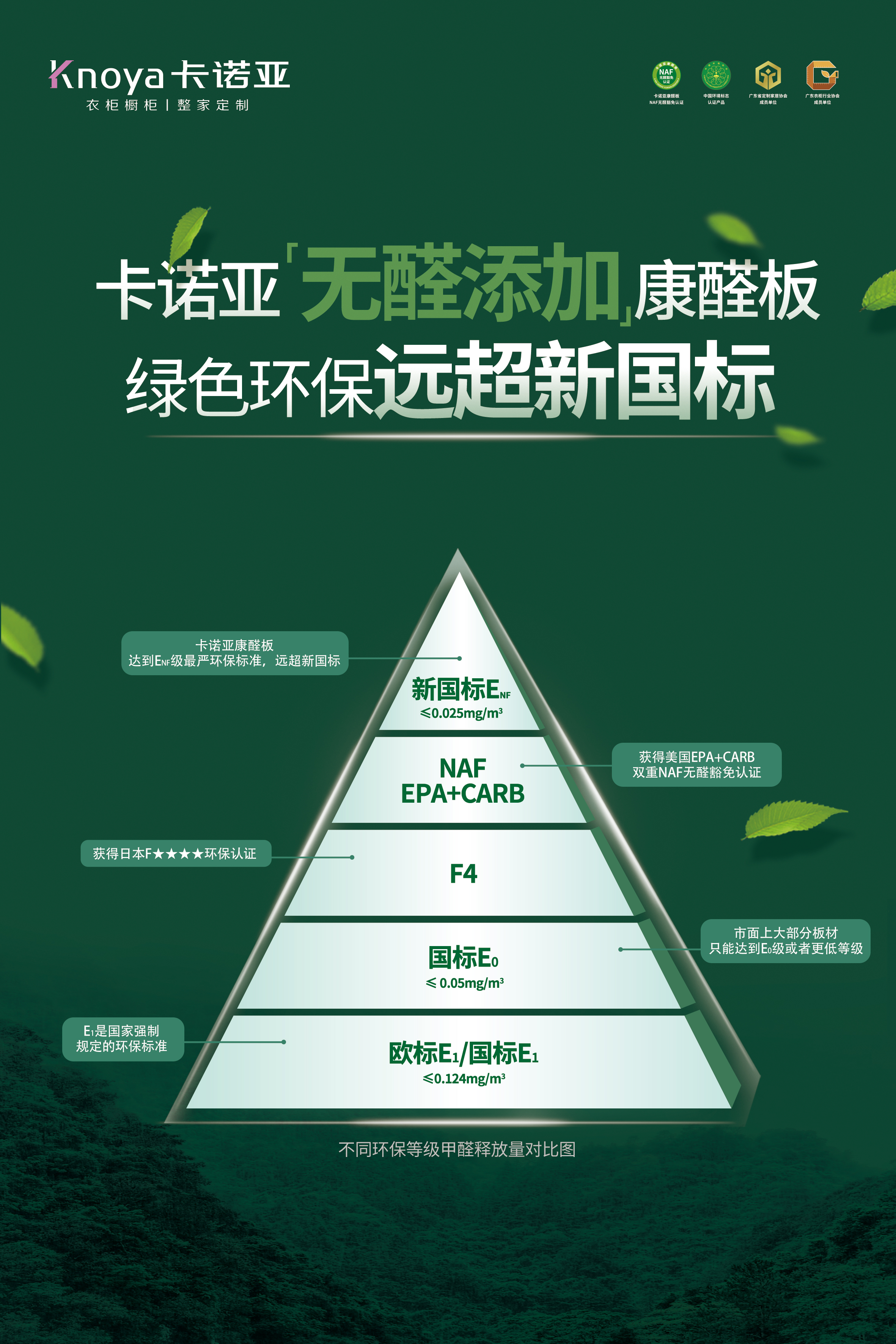 2021年10月1日實施新國標,將企業室內用人造板及其製品的甲醛釋放量分為三個標準,E1級甲醛釋放量為≤0.124mg/m³,E0級為≤0.050mg/m³,最嚴苛的ENF級為≤0.025mg/m³,國家對人造板環保品質提出了更高要求。91香蕉污视频推出的康醛板,經權威部門檢測,甲醛釋放量≤0.025mg/m³,達到了全球最嚴格的ENF級環保標準。