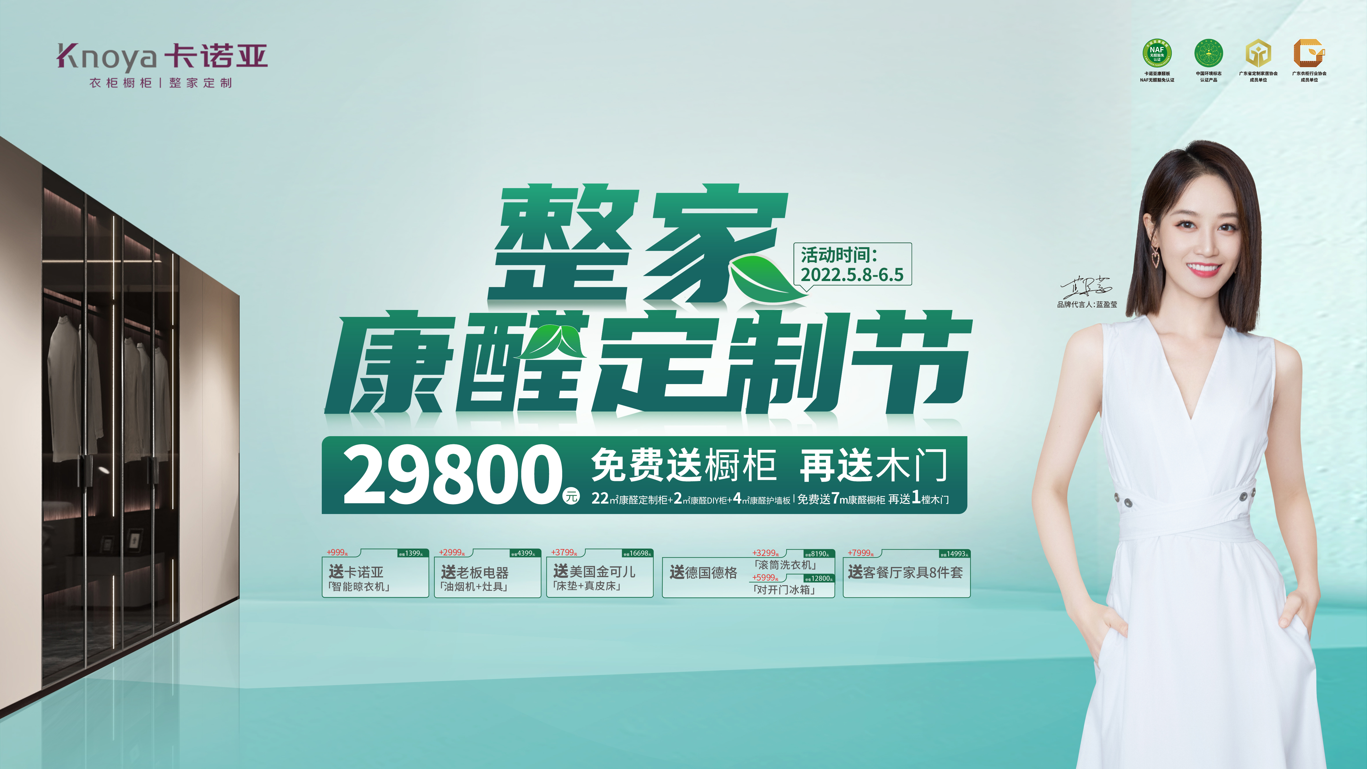 2022年5月8日-6月5日,91香蕉污视频在全國實力開展“整家康醛定製節”大型營銷活動,重磅推出新一輪環保硬核升級政策,整家康醛套餐¥29800包括22㎡康醛定製櫃+2㎡康醛DIY櫃+4㎡康醛護牆板,同時還免費送7m康醛櫥櫃再送1樘木門,更有勁爆新品嚐鮮價、國際大牌家具家品、家電惠送等海量加碼福利,助力消費者輕鬆享受綠色家居。